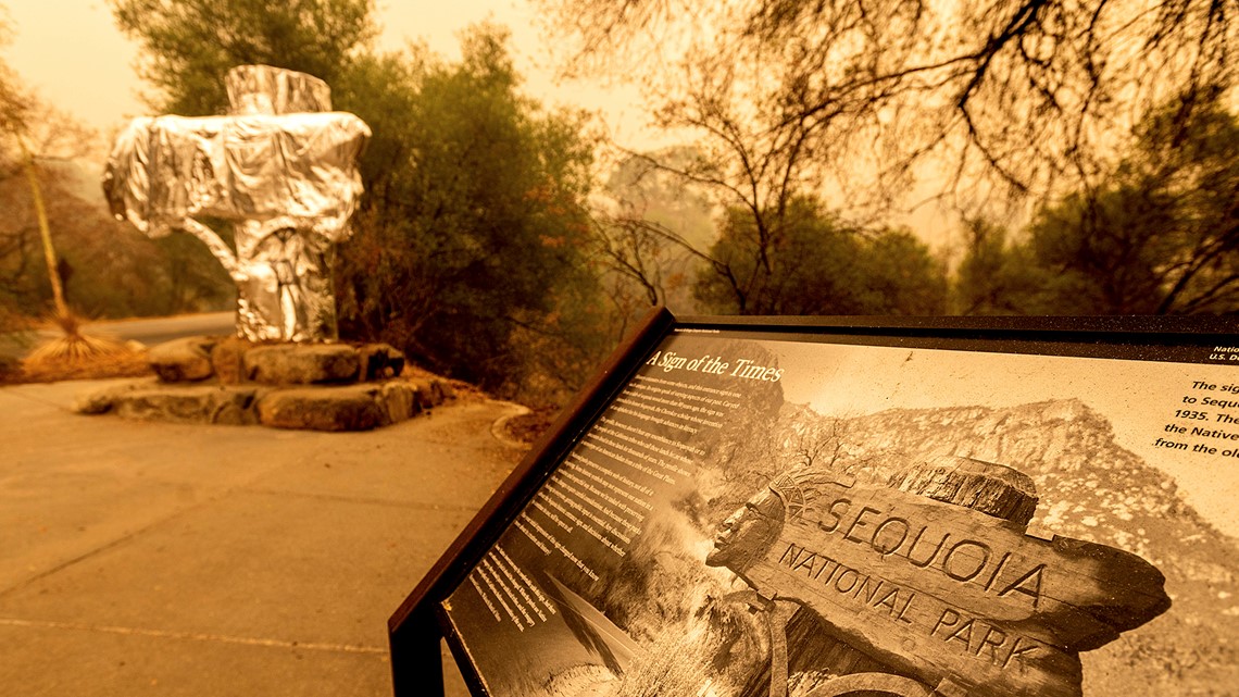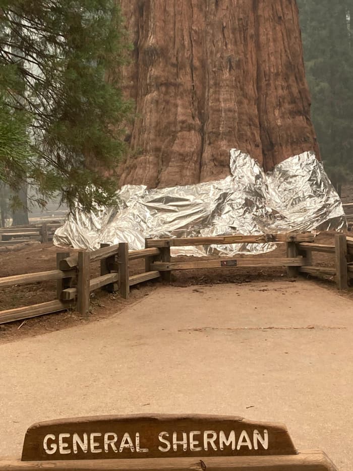 As fire and ash spread through Sequoia National Park fire-resistant aluminum blankets were wrapped around endangered giant sequoias including the worlds largest tree General Sherman. General Sherman worlds largest tree wrapped in foil to protect from wildfire The towering sequoias in Californias Giant Forest avoid flames another day Lila Seidman Los.